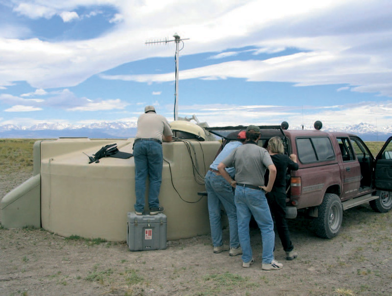 Ricercatori al lavoro, mentre riparano uno dei rivelatori di Auger.