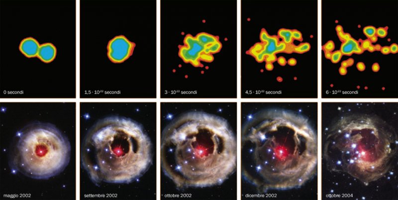 Simulazione numerica del processo di multiframmentazione che si verifica nel corso di una collisione fra nuclei a energie di laboratorio dell’ordine delle decine di MeV per nucleone. In basso: osservazioni del telescopio Hubble della stella V838 Monocerotis . Il lampo di luce prodotto dalla violenta esplosione, che agli inizi del 2002 ha reso questa stella la più luminosa di tutta la Via Lattea, si propaga all’interno degli strati di polvere che la stella aveva emesso in precedenza, illuminandoli a distanze via via crescenti.