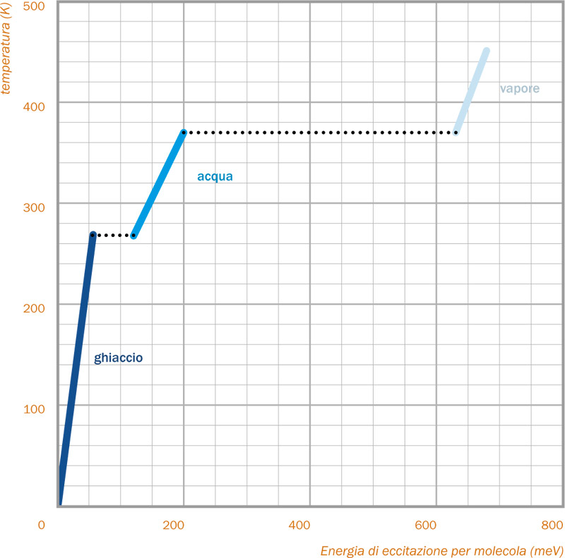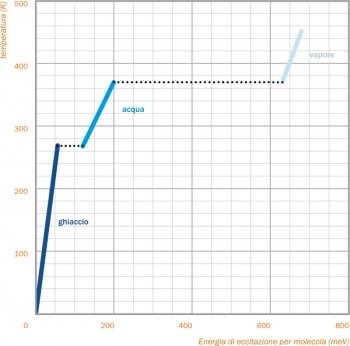 La curva calorica di materia nucleare (in basso) presenta un comportamento analogo a quello della temperatura dell’acqua in ebollizione (in alto). Osserviamo che, in entrambi i casi, la temperatura si mantiene costante in un certo intervallo, nonostante il calore fornito al sistema. Questo comportamento indica il verificarsi di una transizione fra due diversi stati di materia: il calore fornito viene utilizzato per rompere i legami del liquido (che si converte in vapore) e la temperatura si mantiene costante.