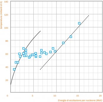 La transizione di fase liquido-gas, predetta dalle teorie nucleari da più di venti anni, ha trovato varie conferme sperimentali nell’ultimo decennio, grazie allo sviluppo di rivelatori sempre più sofisticati, in grado di identificare frammenti e particelle leggere (il vapore nucleare) emessi nel corso di una reazione. Più precisamente, identificando e misurando i frammenti emessi, è possibile risalire all’energia depositata nel sistema e alla sua temperatura. Mettendo in relazione in un grafico queste due quantità, ecco apparire la curva calorica dei nuclei, che presenta somiglianze straordinarie con quella dell’acqua e che ci riporta a quel fenomeno che, forse inconsapevolmente, osserviamo tutti i giorni quando facciamo bollire l’acqua in pentola per prepararci un piatto di spaghetti. Le intense forze nucleari frenano i nuclei interagenti, convertendo grossa parte della loro energia cinetica in calore. Per effetto della compressione generata dall’urto e delle elevate temperature raggiunte, il sistemasi dilata. L’energia assorbita viene utilizzataper rompere i legami del liquido nucleare chesi trasforma in vapore a più bassa densità,mentre la temperatura si mantiene costante. E se l’acqua bolle a 100 gradi centigradi, i nuclei bollono a circa 50 miliardi di gradi kelvin!