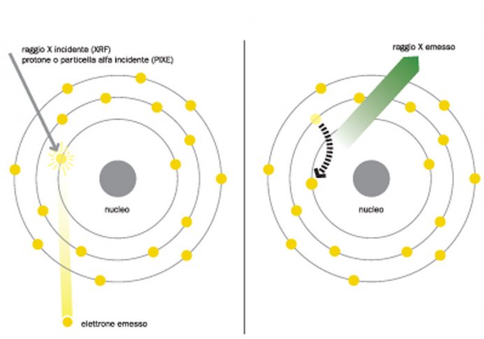 Schematizzazione del processo di emissione di raggi X indotta da particelle cariche incidenti (protoni o particelle α), nel caso della tecnica Pixe, o da raggi X incidenti, nel caso della tecnica Xrf. A sinistra è visibile come uno degli elettroni interni che circondano il nucleo viene emesso e produce un "buco" nell'orbitale. A destra, un elettrone di un orbitale esterno va a riempire il buco prodotto e viene emesso uno o più raggi X di fluorescenza (freccia verde), la cui energia è tipica dell'elemento chimico in esame.