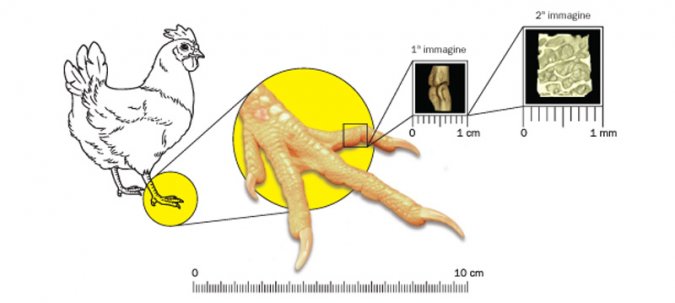 Nella 1ª immagine è mostrato il risultato di una Tac eseguita su un'articolazione di un dettaglio di una zampa di pollo. L'immagine tomografica permette di visualizzare anche volumi posti all'interno dell'osso, come ad es. il particolare mostrato nella 2ª immagine, composto da una rete di trabecole ossee il cui spessore medio è compreso tra 50 e 100 micrometri.