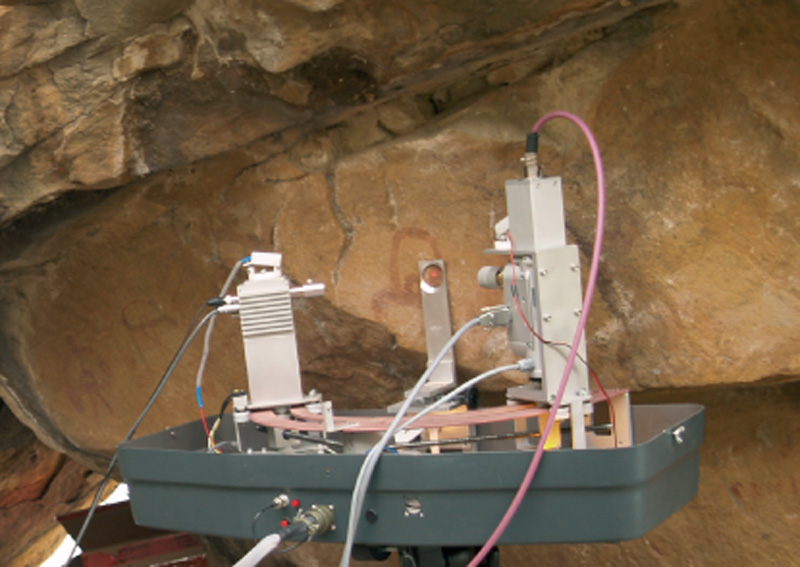 d.Il Rifugio Cassataro a Centuripe, in provincia di Enna, dove pitture rupestri di epoca preistorica (che si intravedono dietro allo strumento) sono state analizzate in situ mediante la strumentazione Xrd. L'analisi ha evidenziato l'utilizzo di ocra per la realizzazione del pigmento.