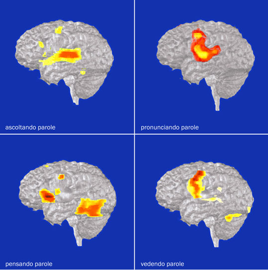 b. Le nuove frontiere delle applicazioni cliniche della Pet riguardano gli studi in campo neurologico, in particolare sulla malattia di Alzheimer e sul morbo di Parkinson. Nella figura sono rappresentate le immagini ottenute tramite Pet di un cervello umano nell’atto di ascoltare, pronunciare, pensare o vedere delle parole.