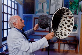 Lo scultore Michele Cossyro con la sua opera Buco nero.