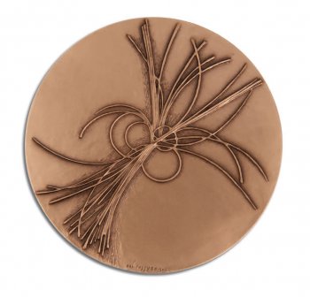 La medaglia al bosone di Higgs, creata da Michele Cossyro per l’Aiam (Associazione Italiana dell’Arte della Medaglia), in mostra a Roma al Vittoriano in Suggestioni in metallo: l’arte della medaglia tra Ottocento e modernità nel dicembre 2013.