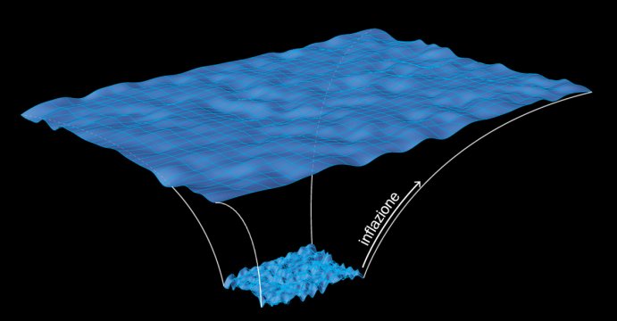 Durante l’inflazione le minuscole increspature dello spaziotempo dovute alle fluttuazioni quantistiche vengono stiracchiate su distanze cosmologiche, a causa dell’espansione accelerata dell’universo.