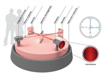 b.Schema dell'interferometro di Michelson. La luce generata dalla sorgente viene divisa in due fasci dallo specchio semi-argentato. I fasci si riflettono sui due specchi, per poi tornare a quello semiargentato e giungere infine al rivelatore.