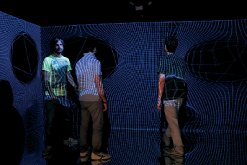 Immaginate di entrare in una stanza le cui pareti siano "sensibili" e si incurvino e deformino per effetto della vostra presenza. E che i vostri movimenti producano così in questo spazio vibrazioni e onde. O di poter osservare le impercettibili e invisibili tracce delle particelle cosmiche che ci attraversano in ogni istante. O infine di accelerare virtualmente con le vostre mani fasci di particelle subatomiche fino a produrre collisioni multiformi e colorate, simili a quelle prodotte nei grandi acceleratori di particelle, come ad esempio in Lhc al Cern di Ginevra. Sono solo alcuni esempi delle esperienze immersive e interattive che è possibile fare visitando le mostre più recenti dell'Infn, in cui esplorare inedite metafore visive di fenomeni o idee fondanti del mondo fisico, riproduzioni immersive e scenografiche dei grandi apparati sperimentali, visualizzazioni spettacolari e in tempo reale dei fenomeni fisici. Come nell'installazione in cui lo spettatore visualizza e percepisce cosa significhi una deformazione dello spazio, analoga a quella prodotta sul tessuto dello spaziotempo dai pianeti, le stelle o i buchi neri (vd. fig. a). Un'idea fondamentale introdotta da Einstein con la relatività generale e che rappresenta il modo contemporaneo di spiegare la gravità, ma certamente difficile da raccontare.