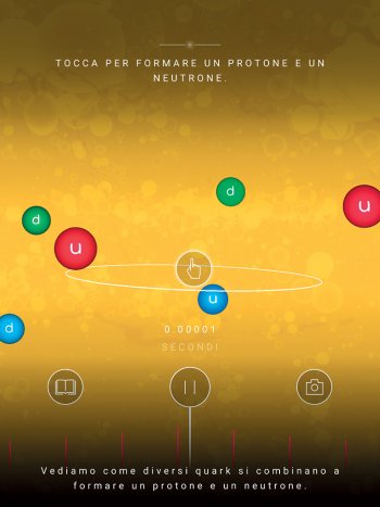 Punto di riferimento dell’applicazione, che le permette di assumere il punto di vista di chi guarda, è la mano dell’utente: registrate le coordinate della sua posizione, Big Bang AR è l’occhio di chi guarda, capace di osservare nei dettagli che cosa lo circonda e di ricostruire la formazione e l’evoluzione dell’universo dalla sua origine. Il viaggio di 13,8 miliardi di anni dal Big Bang a oggi dura una quindicina di minuti, sempre che non ci si voglia soffermare a osservare i tanti spunti che si incontrano lungo la strada. E la scoperta più straordinaria è forse proprio questa: non importa in quale direzione rivolgiamo lo sguardo (la mano), l’universo si presenta sempre nello stesso modo: lo stesso fondo cosmico a microonde, la stessa composizione di stelle, la stessa densità di galassie. Guidati dalla voce narrante dell’attrice Tilda Swinton (nella versione in inglese) e da musiche dal sapore “cosmico”, è possibile interrogare l’universo interagendo con gli elementi che appaiono sullo schermo e assistere alla nascita delle prime stelle, del nostro sistema solare e della Terra stessa. Si può inoltre far ruotare il cellulare o il tablet per osservare stelle, galassie e pianeti da angolazioni diverse od osservare da vicino la formazione di tutte le strutture che hanno portato all’esistenza di quello che conosciamo: quark, protoni e neutroni, nuclei leggeri, atomi e molecole, cellule e organismi multicellulari.