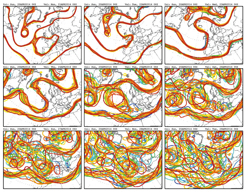 b.Esempio di spaghetti-plot (modello Gfs) del 20 aprile 2014 alle ore 06 Utc (tempo coordinato universale). Si noti come le curve tendono a sparpagliarsi giorno dopo giorno fino al 29 aprile, e anche come non in tutte le regioni le previsioni hanno lo stesso grado di attendibilità. È comunque chiaro che la significatività delle ultime tre mappe (e spesso anche delle tre centrali…) è assolutamente nulla e non consente alcun tipo di previsione oggettiva. In particolare, nei pressi della Groenlandia, già il giorno 22, ovvero due soli giorni dopo l’elaborazione del modello, si nota una significativa divergenza delle correnti, che genera posizioni e intensità dei minimi diverse tra le varie mappe.