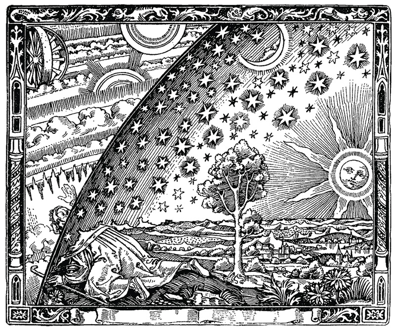 b.Urbi et orbi, autore anonimo, xilografia (pubblicato per la prima volta in L’atmosphère: météorologie populaire di Camille Flammarion, Parigi, 1888).