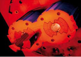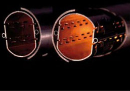 c. Sezione trasversale del tubo nel quale il fascio di particelle di Lhc è accelerato a velocità prossime alla velocità della luce. Il tubo ha la funzione di proteggere i magneti dalle radiazioni emesse dal fascio. I magneti, infatti, che funzionano a temperature molto basse, al contatto con le radiazioni si scalderebbero. Le fessure visibili nell’immagine permettono alle molecole di gas residui di attraversare la schermatura ed essere “congelate” sulle pareti del tubo del fascio, mantenuto a sua volta a una temperatura molto bassa.