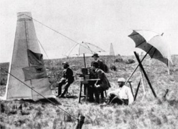 h. La prima misura di campo gravitazionale condotta da Loránd Eötvös con la bilancia di torsione sulla collina di Ság, nel Transdanubio occidentale, nell’agosto del 1891. Eötvös è visibile in secondo piano, seduto davanti allo strumento.
