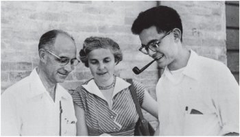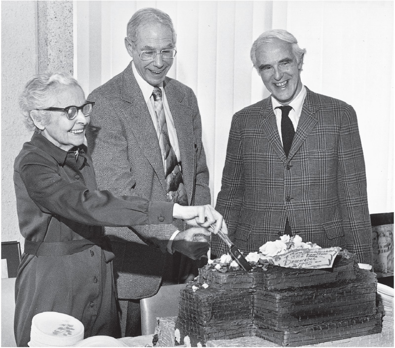 a.Laura Fermi (a sinistra), mentre taglia la torta a forma di “pila” preparata all’Argonne National Laboratory per le celebrazioni del 35° anniversario della prima reazione a catena raccontata in questo articolo. È una delle ultime foto esistenti di Laura Fermi, deceduta il 26 dicembre 1977.