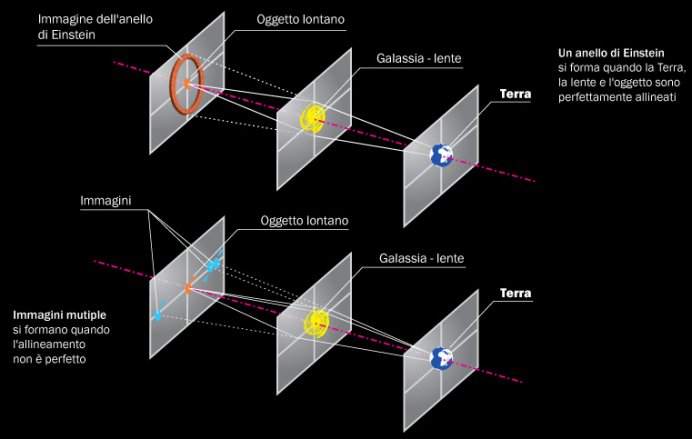 Lente gravitazionale. Disposizione relative della sorgente, della lente e della Terra per cui la luce proveniente dalla sorgente passando sui lati opposti della lente viene deviata simulando in alto un anello luminoso e in basso due immagini dell’oggetto sorgente.