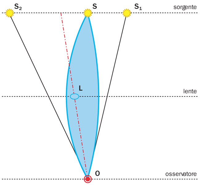 a. Funzionamento di una lente gravitazionale. La disposizione relativa della sorgente S, della lente L e dell’osservatore O fa sì che la luce proveniente da S passando sui lati opposti di L venga deviata producendo immagini S1 e S2 dello stesso oggetto.