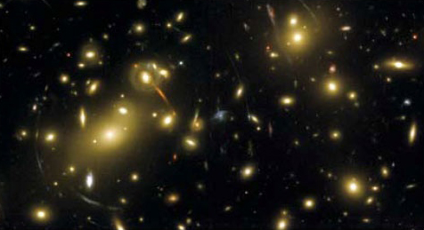 c. Grandi concentrazioni di massa possono agire come lenti. Quasi tutti gli oggetti luminosi della fotografia sono galassie nell’ammasso noto come Abel 2218. Esso ha una massa così grande e compatta da provocare la deflessione della luce proveniente da galassie che si trovano al di là di questo, che quindi appaiono a noi distorte a forma d’arco. Nella fotografia, ripresa dal telescopio Hubble, sono visibili molti archi, allungati e di debole intensità.