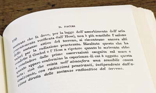 a.Frase conclusiva dell'articolo di Domenico Pacini apparso su Il Nuovo Cimento, serie VI, Tomo III, pagg. 93-100, 1912. Da sottolineare l'espressione "Risultato questo che ha condotto il Gockel e l'Hess a ripetere quanto lo scrivente ebbe a concludere..."; il risultato è quello dell'esperimento in pallone di Gockel di cui si parla subito sopra, e la conclusione è quella scritta in corsivo in questa figura.