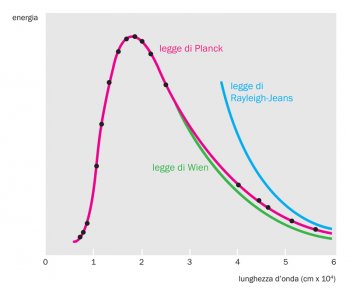 Sul problema dell’incompatibilità della legge di Wien con i dati sperimentali nella zona delle lunghezze d’onda lunghe, nel giugno del 1900, poco prima di questo intervento risolutivo di Planck, interveniva Lord Rayleigh, con un breve articolo, di cui Planck non era al corrente. Egli arrivava a un’espressione di u(λ,T ) (chiamata poi legge di Rayleigh-Jeans), che era proporzionale a T e a λ-4 e che, fissata T, funzionava bene per le alte λ. Essa, tuttavia con il tendere di λ a zero, cresceva rapidamente all’infinito (vd. fig. b) e quindi implicava, contro l’evidenza sperimentale, che l’energia totale emessa dal corpo nero fosse infinita. Questa situazione è ciò che Ehrenfest nel 1911 chiamerà “catastrofe ultravioletta”. Rayleigh, tuttavia, non proponeva di estendere a piccole λ la legge di distribuzione in questa forma, ma introdusse un fattore di abbattimento della curva, uguale a quello introdotto da Wien con il risultato che la sua legge, per λ tendente a zero, non portava a nessuna “energia infinita”. Insomma, nel 1900 non c’era nessuna legge teorica a mostrare le difficoltà della fisica classica nel trattare il corpo nero e a spingere verso la ricerca di strade alternative. Sarà solo nel 1905 che Jeans pubblicizzerà la legge derivata da Rayleigh, correggendone un calcolo (da qui il nome di legge di Rayleigh-Jeans), ma rendendosi anche conto dei suoi limiti. Però siamo ormai nel 1905: la formula di Planck era ormai accettata e sull’ipotesi dei “quanti” i fisici, primo fra tutti Einstein, stavano cominciando a lavorare, discutendone i fondamenti e cercando di estenderla ad altri campi.