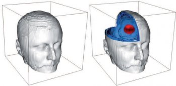 b.Modellizzazioni del cranio basate sulle Tac del paziente (in bianco la pelle e in blu le ossa) e sul volume tumorale (in rosso) definito secondo le indicazioni dell’oncologo.