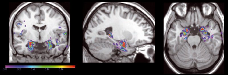 b.Sezione coronale (a sinistra), sagittale (al centro) e assiale (a destra) di una immagine di risonanza magnetica cerebrale. Le regioni in colore indicano le zone clinicamente rilevanti per la diagnosi precoce di soggetti affetti da malattia di Alzheimer.
