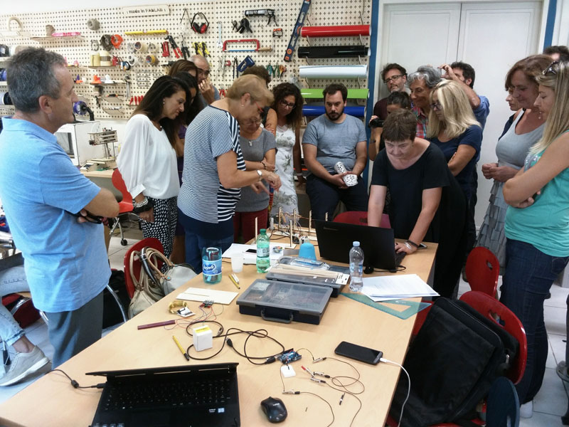 L’avvento delle nuove tecnologie ha reso sempre più necessario un aggiornamento costante dei docenti, che permetta loro di attuare nuove modalità di insegnamento/apprendimento e di costruzione attiva e creativa della conoscenza, per sostenere gli studenti nell’interpretazione della realtà che li circonda. In questo contesto, dal 12 al 14 settembre presso il Fablab della fondazione Mondo Digitale di Roma, si è tenuta la prima edizione della “Scuola di Arduino e Smartphone”, un corso di aggiornamento per docenti di materie scientifiche della scuola secondaria di secondo grado, promosso dal Dipartimento di Fisica della Sapienza Università di Roma nell’ambito del Piano Lauree Scientifiche (Pls), con la collaborazione dell’Infn. La prima giornata del corso è stata caratterizzata da lezioni e seminari che hanno illustrato le peculiarità e le potenzialità della scheda Arduino, dopo un’introduzione del prof. Alfonso Molina, direttore scientifico di Mondo Digitale, sulle attività della fondazione. Successivamente, il prof. Giovanni Organtini della Sapienza ha tenuto una lezione sull’apprendimento base della programmazione della scheda Arduino e, in conclusione di mattinata, Frederic Bouquet, professore presso l’Università di Paris-Sud, ha tenuto un seminario sull’uso di sensori e trasduttori per Arduino. La giornata si è quindi conclusa con il seminario del prof. Tommaso Tabarelli de Fatis dell’Università Bicocca, in cui sono state illustrate le app di fisica utilizzabili con i sensori di uno smartphone. Nei due giorni seguenti, noi insegnanti siamo stati suddivisi in gruppi e ci siamo dedicati alla progettazione e realizzazione di esperimenti di fisica, utilizzando sia le risorse presenti nel Fablab, che materiali di uso comune di facile reperibilità in negozi di casalinghi. Abbiamo creato circuiti con Arduino e utilizzato il suo ambiente di programmazione, scaricando liberamente dal web schemi di funzionamento e librerie. Noi tre in particolare abbiamo realizzato un esperimento per lo studio del moto di un carrellino lungo un piano inclinato. Non è stato semplice apprendere e applicare le nozioni base del coding e, a volte, la realizzazione concreta di quanto progettato ha incontrato degli ostacoli che hanno frustrato le aspettative dei docenti. Ma il lavoro di gruppo e l’empatia diffusa hanno fatto superare tutti gli ostacoli e poi … che soddisfazione illustrare il proprio progetto didattico! Quanto appreso con entusiasmo in questi tre giorni di full¬immersion su Arduino e il suo mondo avrà naturalmente una positiva e proficua ricaduta nella didattica (laboratoriale) della fisica.