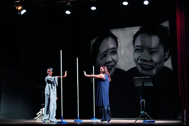 a.L’attrice Elena Ruzza e la soprano Fé Avouglan durante una rappresentazione de “La forza nascosta” al CineTeatro Baretti di Torino.
