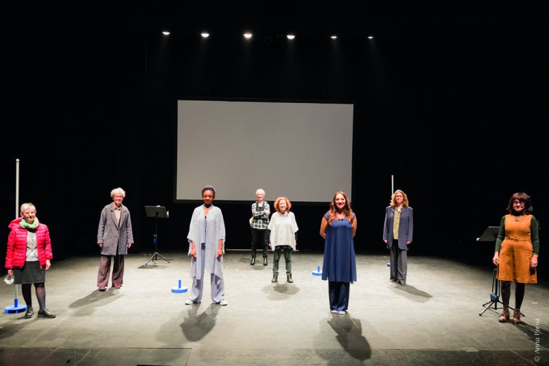 b. Foto di gruppo delle ideatrici, curatrici, autrici e interpreti de “La forza nascosta”, scattata al Teatro della Tosse di Genova in occasione dell’anteprima dello spettacolo.