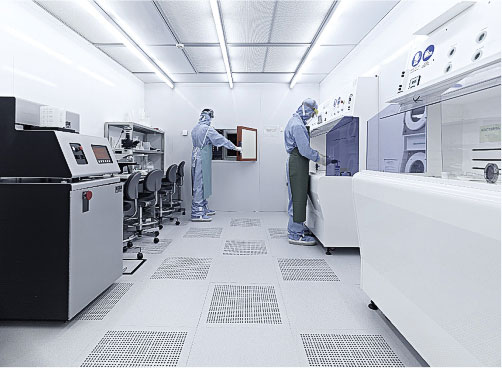 Un ricercatore della Fondazione Bruno Kessler all'interno della camera pulita del laboratorio di microtecnologie, l'MTLab
