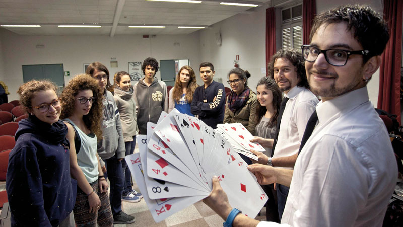 b.Diego Rizzuto (a destra) con il suo collega matematico Paolo Canova durante una lezione di probabilità, tenuta agli studenti del Liceo Classico Gioberti di Torino nel 2013.