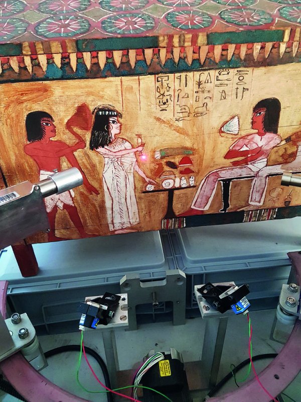 b.Strumentazione portatile della collaborazione Landis dell’Infn e del Cnr in opera presso il Museo Egizio di Torino, durante le analisi dei manufatti dipinti della tomba di Kha e Merit.