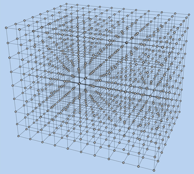 Toccando una superficie levigata, non potremmo mai immaginare come questa, in realtà, sia discontinua a livello atomico: i nuclei dei vari atomi, di cui è fatta la superficie, sono infatti regolarmente disposti, ma in punti dello spazio lontanissimi tra loro rispetto alle dimensioni nucleari. Molte omogeneità delle cose che vediamo sono dovute alla scarsa capacità di risoluzione dei nostri sensi. C'è una quantità che comunque pensiamo omogenea e continua: lo spaziotempo intorno a noi, ovvero quel contenitore anonimo, nel quale oscillano le onde di radiazione e di materia di cui si animano i costituenti più elementari del mondo che ci circonda. Quando scriviamo le equazioni che governano le interazioni fondamentali, pensiamo sempre a uno spaziotempo che si può suddividere all'infinito, un continuo ininterrotto di punti. Se classicamente questa assunzione non comporta problemi, quando includiamo in queste equazioni gli effetti della meccanica quantistica, che ci dice che a piccolissime distanze le leggi non sono più deterministiche, ma fissano solo le probabilità relative di eventi tutti possibili, la pretesa di scrivere equazioni valide a distanze arbitrariamente piccole crolla. Si scopre l'esistenza di un fenomeno che rischia di rendere inutili le equazioni stesse: cioè che le onde, le quali oscillano con frequenze altissime e quindi cambiano su distanze piccolissime assieme alle loro lunghezze d'onda, rendono le correzioni quantistiche – alle predizioni della teoria classica – "infinite", ovvero non trattabili matematicamente. In realtà, le teorie che descrivono la natura riescono a fare predizioni affidabili al prezzo di un compromesso: si descrivono solo le relazioni tra fenomeni fisici che avvengono a due diverse capacità di risoluzione. Sembra che, quando si scrive una teoria, non si debba pretendere che descriva il mondo fino all'infinitamente piccolo, ma che ci si debba accontentare che porti da quello che si può misurare con la risoluzione che si ha, a quello che si vede con una risoluzione migliore ma finita. Questo ci permette di porre un limite inferiore alla più piccola lunghezza con la quale può oscillare un'onda e ricavare le relazioni tra fenomeni fisici a energie diverse, che sono indifferenti alla limitazione introdotta. Il modo più semplice di fare questo è di considerare uno spaziotempo non "continuo", bensì costituito da un insieme discreto di punti, un reticolo sottilissimo di cui non arriviamo a percepire le maglie, tanto sono strette (vd. fig.a). Questo fa perdere una simmetria importante come quella di Lorentz, ovvero le rotazioni nello spazio ordinario e quelle speciali nello spaziotempo di Einstein. Vengono rimpiazzate da simmetrie discrete. Se il reticolo è ordinato in ipercubi (cubi con più di tre dimensioni), solo girando di novanta gradi appare identico, un po' come succede con file di alberi piantati ordinatamente: se ne vede uno solo, se ci si allinea in una certa direzione. Se però la sensibilità dei fenomeni che studiamo è rozza, come il polpastrello della nostra mano che tocca la superficie levigata, la simmetria sembrerà esatta, a dispetto della tessitura microscopica. Su questo reticolo ordinato viaggiano le onde, che naturalmente non possono oscillare dove non ci sono punti dello spaziotempo, e che quindi hanno proprio una lunghezza minima di oscillazione data dal passo del reticolo. La possibilità di scrivere le equazioni su un reticolo discreto ha un ulteriore vantaggio che ne ha decretato il successo. In un reticolo con un numero finito di punti si possono fare calcoli con l'aiuto di un calcolatore. Su di esso vengono "simulate" possibili configurazioni di onde e ne vengono campionate in numero sufficiente da riprodurre in media quello che accade in una soluzione esatta: su questo campione vengono effettuate le "misure" (si tratta naturalmente di simulazioni di misure), che si possono confrontare con le misure fatte dagli esperimenti. Una teoria, a tutt'oggi irrisolta e per la quale si ricorre a questo tipo di simulazioni numeriche per stime accurate, è quella della cromodinamica quantistica, ovvero la teoria che descrive le interazioni dei quark e dei loro "collanti" (i gluoni) all'interno dei protoni e neutroni che costituiscono il nucleo di un atomo. Solo attraverso simulazioni numeriche è possibile verificarne la validità nel regime in cui le interazioni sono più forti e solo attraverso le loro conferme siamo oggi fermamente convinti che la teoria sia quella giusta. Naturalmente l'accuratezza della risposta dipende dal numero di punti totali che ci si può permettere di simulare, ovvero in definitiva dalla potenza del calcolatore a disposizione. Se per ogni punto del reticolo (e oggi si arriva a reticoli con dieci milioni di punti) vi sono un centinaio di numeri che servono a descrivere le onde dei quark e gluoni, si arriva a un totale di circa un miliardo di numeri per ogni campione. E poi c'è il problema di risolvere sistemi di equazioni lineari con milioni di variabili: insomma, una mole di calcoli che mette a seria prova la potenza dei calcolatori più veloci. Non a caso il settore della cromodinamica quantistica rappresenta uno dei migliori banchi di prova per lo sviluppo di calcolatori superveloci che organizzano la propria architettura in funzione delle prestazioni che si hanno nelle simulazioni numeriche delle interazioni forti su reticolo.