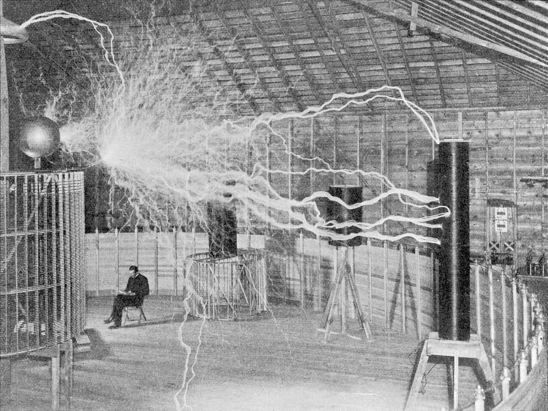 b.Nikola Tesla, ingegnere elettrico, inventore e fisico serbo naturalizzato statunitense, è conosciuto per i numerosi contributi nel campo dell’elettromagnetismo tra la fine dell’800 e gli inizi del ’900. L’unità di misura dell’intensità del campo magnetico porta il suo nome. In questa foto realizzata a scopi pubblicitari, Tesla è ripreso mentre produce “luce” artificiale nel suo laboratorio di Colorado Springs.