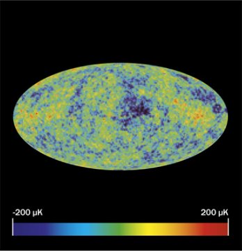 Mappa del fondo cosmico a microonde “visto” da WMAP (http://map.gsfc.nasa.gov). L’immagine mostra le fluttuazioni di temperatura (segnalate dai diversi colori) dell’Universo primordiale, 380.000 anni dopo il Big Bang. Le zone a temperature diverse corrispondono ai grumi di materia cresciuti fino a formare le galassie. L’escursione termica massima tra i diversi punti è di 400 milionesimi di grado kelvin.