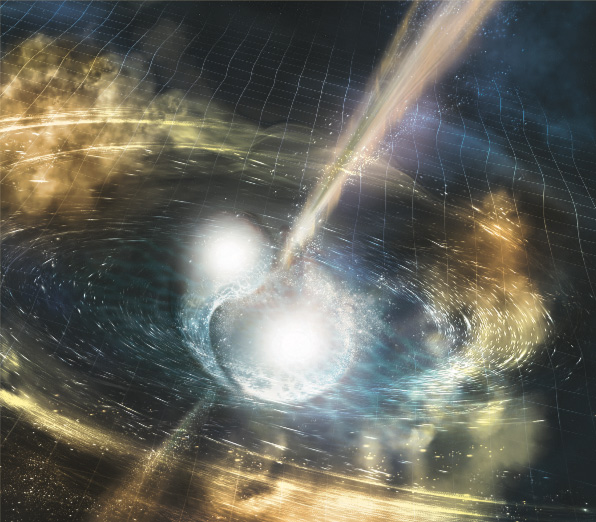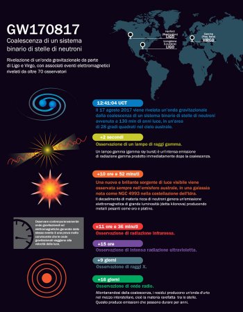 afterglow”) che accompagna, a qualche giorno di distanza, l’emissione dei lampi gamma. Al di là del fascino rappresentato dall’osservazione così complessa e variegata di un fenomeno mai visto prima, questo evento ha un immenso valore scientifico, le cui conseguenze sono ancora in gran parte da comprendere. Il segnale gravitazionale ha fornito informazioni preziose non solo sulle proprietà delle stelle coinvolte nella fusione (per esempio, la loro massa), ma anche su problemi di fisica fondamentale, tra cui il limite superiore della massa del gravitone, la misura dell’accuratezza della teoria della relatività generale e il comportamento della materia nucleare.