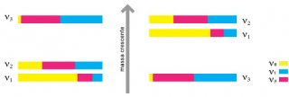 Quale è lo spettro di massa dei neutrini? I tre tipi di neutrino conosciuti, noti come neutrino elettronico, muonico e del tau, sono in realtà un “mix” di altrettanti neutrini, con masse ben definite e differenti, chiamati 1, 2 e 3. Gli esperimenti indicano che 2 pesa più di 1, ma non sappiamo ancora se il terzo neutrino sia il più pesante (a sinistra), oppure il più leggero (a destra).