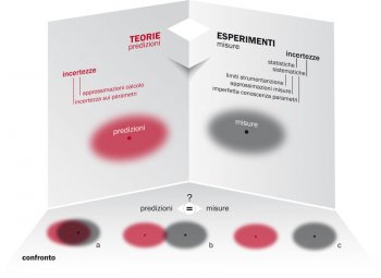 c.Uno dei punti chiave del progresso della conoscenza scientifica è il continuo confronto tra teoria ed esperimento. Il maggiore o minore accordo tra i due fornisce informazioni importanti alla comprensione dell’universo in cui viviamo. Sia la predizione che la misura sono affette da incertezze: se indichiamo con un punto il valore centrale di entrambe, possiamo rappresentarne l’incertezza come una regione più o meno grande che contiene con una certa probabilità i risultati di ripetute predizioni o misure della stessa quantità. Se ora confrontiamo la predizione con la misura, possiamo avere tre situazioni diverse: a sinistra, le incertezze si sovrappongono ampiamente, per cui possiamo affermare che la predizione e la misura sono in accordo; a destra, non c’è sovrapposizione, per cui possiamo affermare che la misura e la predizione non sono in accordo; al centro vediamo che le due incertezze si toccano appena: in questo caso non possiamo trarre conclusioni e dobbiamo diminuire le incertezze sulle misure e/o sulle predizioni per poter arrivare a una conclusione.