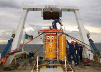 e. La junction-box di Nemo viene calata in mare lo scorso dicembre durante la prima fase dell’esperimento. All’interno del contenitore giallo in vetroresina, riempito di olio, si trovano i contenitori a pressione, dentro i quali sono stati installati l’elettronica e i cavi elettro-ottici di interconnessione.