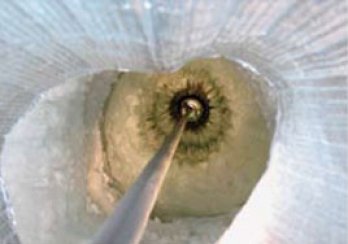 c. Costruzione di una stringa di IceCube: è visibile un modulo ottico mentre viene calato nell’abisso di ghiaccio.