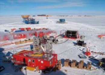 d. La stazione di Amundsen-Scott durante la stagione estiva 2006-2007. È visibile in primo piano la torre nella quale viene effettuato il drilling e il cavo di supporto per i moduli ottici. In fondo si intravede la nuova stazione dove ci sono gli alloggi.