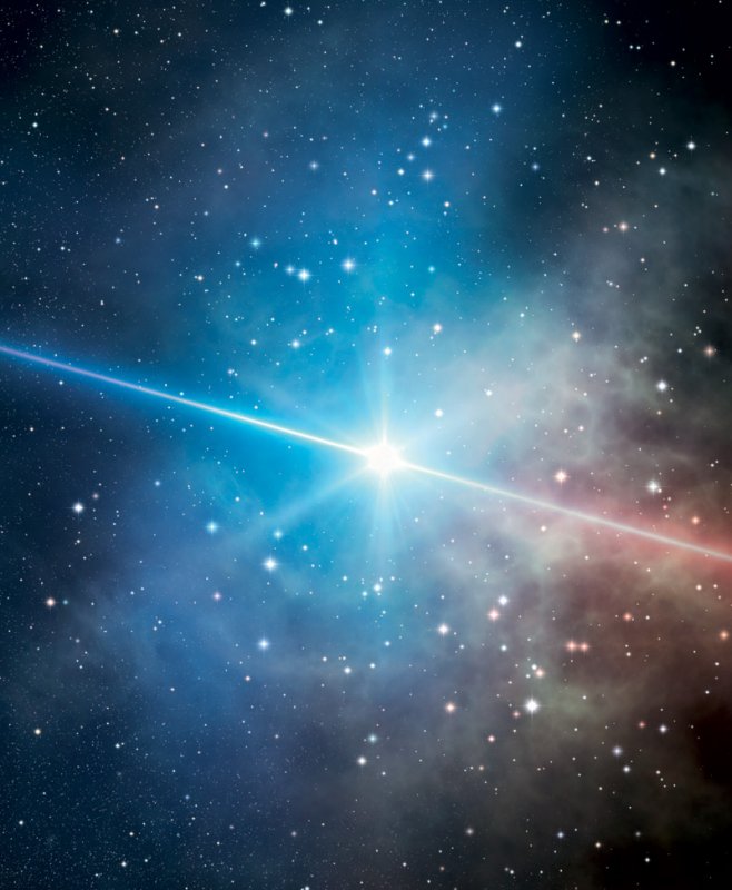 Immagine artistica di un lampo di raggio gamma in una regione di formazione stellare, cioè una porzione di galassia particolarmente ricca di stelle “giovani”.