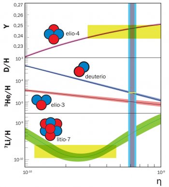 a.Le predizioni delle abbondanze dei nuclei leggeri in funzione del rapporto tra le abbondanze di barioni e di fotoni (η) sono rappresentate dalle bande colorate. Le altezze dei box rettangolari gialli corrispondono alle abbondanze primordiali di elio-4, deuterio (D) e litio-7, determinate da misure astrofisiche (per l’elio-3 non esistono misure affidabili), mentre le basi rappresentano i valori di η che si otterrebbero dal confronto tra previsione teorica e dato osservativo per quel dato nucleo. La banda verticale più larga, in azzurro, corrisponde all’intervallo di valori di η che meglio predicono l’abbondanza di deuterio (l’elio-4 è molto meno sensibile a questo parametro). La banda verticale più stretta, in rosso, corrisponde invece al valore di η misurato dalla radiazione del fondo cosmico a microonde. Come si vede, i due metodi di misurazione di η sono in perfetto accordo. Il riquadro più basso mostra la discordanza tra i valori di litio predetti e quelli osservati.