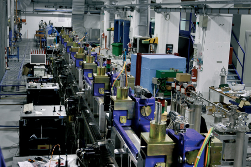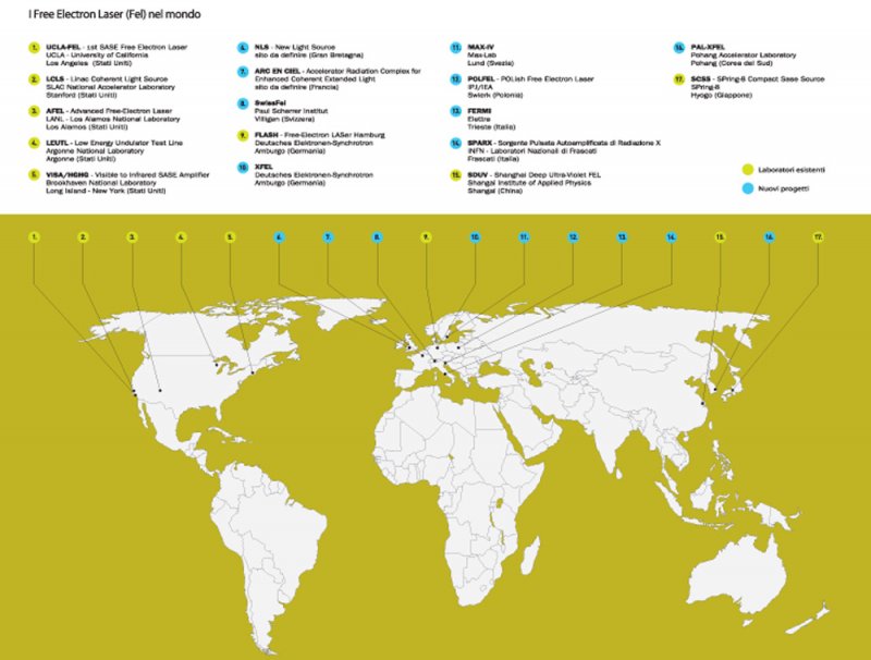 Stimolanti e coerenti, ndr). La sua brillanza, ovvero la sua intensità divisa per l’angolo di emissione, risulta in tal modo altissima, fino a 10 ordini di grandezza superiore a quella della radiazione di sincrotrone convenzionale. Il fenomeno sopra descritto porta infatti a una crescita esponenziale della potenza della radiazione Fel durante la propagazione del fascio di elettroni nell’ondulatore. Questo, insieme al fatto che gli impulsi di radiazione Fel possono essere corti fino a poche decine di femtosecondi (rispetto alle decine di picosecondi della radiazione di sincrotrone), fa sì che si possano condurre esperimenti senza precedenti di “imaging” di singole molecole organiche, proteine, virus ecc. Lo sforzo italiano in questo settore in grande evoluzione è rappresentato dai progetti Sparc, SparX e Fermi. I primi due sono condotti presso i Laboratori Nazionali di Frascati dell’Infn, da parte di una collaborazione tra l’Infn, l’Enea, il Cnr e l’Università di Tor Vergata, mentre il Fel del progetto Fermi è stato messo recentemente in funzione a Trieste dalla Sincrotrone Trieste. Il progetto Sparc ha sviluppato e messo in funzione un acceleratore lineare per produrre fasci di elettroni di altissima brillanza, necessari per pilotare i Fel (vd. fig. c). Il progetto SparX punta alla messa in funzione presso i Laboratori Infn di Frascati di un Fel basato su un acceleratore lineare di elettroni da 750 MeV, per produrre radiazione Fel fino a lunghezze d’onda di 5 nanometri, che corrispondono a un’energia dei fotoni di circa 250 eV.