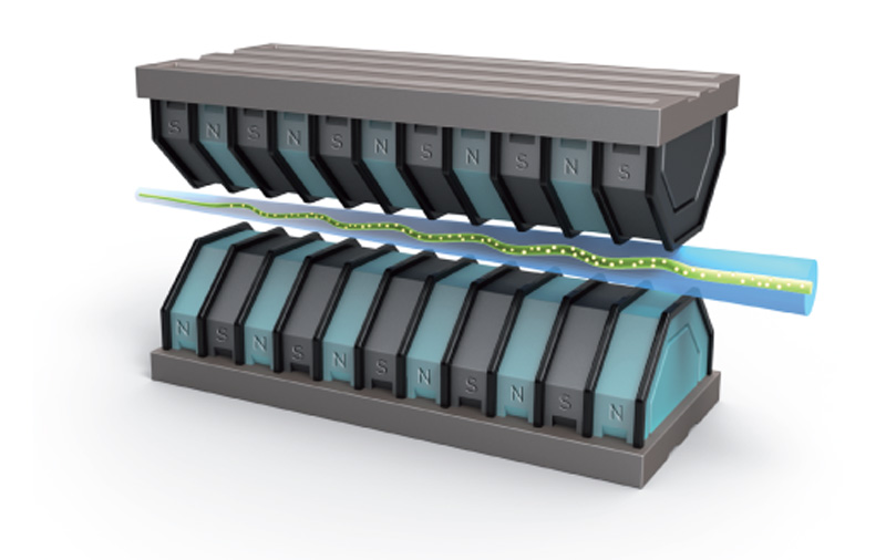 Per rimediare a questa limitazione si sono sviluppati i cosiddetti magneti ondulatori, formati da una successione di un gran numero di calamite con polarità alternata, in modo che l’elettrone sia costretto a percorrere una traiettoria sinusoidale, una sorta di slalom (vd. fig. a).