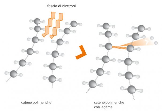 I processi chimici che avvengono all’interno di un polimero irradiato hanno nomi sofisticati come co-polimerizzazione, grafting, curing, degradazione, cross-linking. Questa è una rappresentazione schematica di un esempio di cross-linking, ovvero di giunzione trasversale di due catene polimeriche come risultato della ionizzazione indotta dagli elettroni che attraversano il materiale. Nel caso di fasci di elettroni (e di fotoni, che si ottengono da questi ultimi a energie minime di qualche MeV, facendoli rallentare), i meccanismi di interazione della radiazione con la materia consentono lo sviluppo di due principali aree di applicazione, negli ambiti della biologia e della chimica.