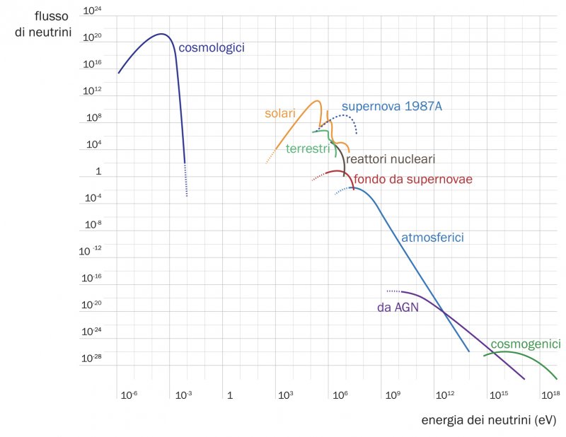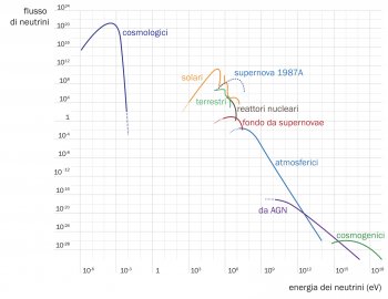a. Il flusso dei neutrini (cioè il numero di neutrini per cm2, per secondo e per MeV di energia) provenienti da varie sorgenti. I neutrini più abbondanti e di più bassa energia sono quelli cosmologici, prodotti subito dopo il Big Bang. All’estremo opposto dello spettro, i neutrini di più alta energia sono i neutrini cosmogenici, prodotti dall’interazione dei raggi cosmici con i fotoni della radiazione cosmica di fondo.
