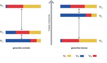 c. Gli stati di neutrino di massa definita (indicati con ν1, ν2, ν3) sono miscele degli stati di definito sapore (neutrino elettronico, neutrino muonico, neutrino tauonico, indicati con un diverso colore). Si conosce l’ordinamento delle masse degli stati ν1 e ν2, ma non si sa se la massa dello stato ν3 è maggiore (gerarchia normale) o minore (gerarchia inversa) delle altre due masse.