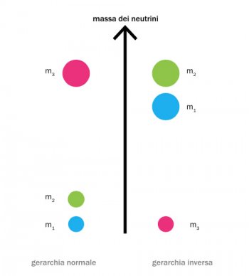 b.Due possibili ordinamenti (“gerarchie”) delle masse dei tre neutrini, che lasciano invariate le loro differenze relative: a sinistra la gerarchia “normale” e a destra la gerarchia “inversa”. Attualmente non conosciamo quale delle due opzioni sia stata scelta dalla natura. A rigore, va detto che le oscillazioni del sapore dei neutrini determinano le differenze dei quadrati delle masse (non delle masse), ma ciò non cambia il concetto di gerarchia.