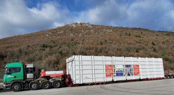 c.Il rivelatore Icarus durante il trasporto dai laboratori del Gran Sasso a quelli del Cern di Ginevra: prima tappa di un lungo viaggio con destinazione Fermilab (nei pressi di Chicago), nell’ambito del progetto sperimentale Dune.